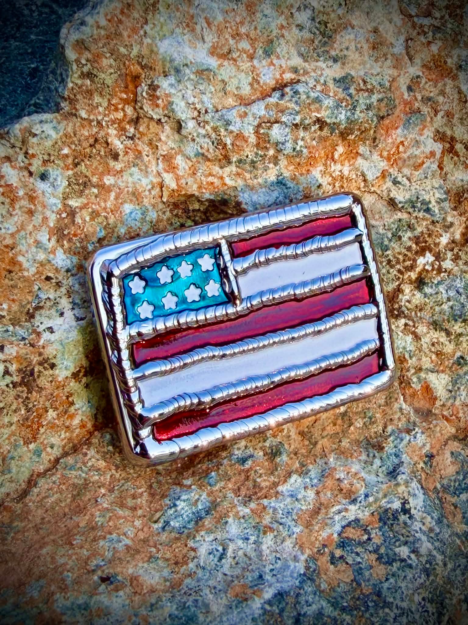 • Artisanal Craftsmanship: Features a hand-welded American flag design on the front and unique hand-stamped icons on the reverse, including the signature "MERICA"