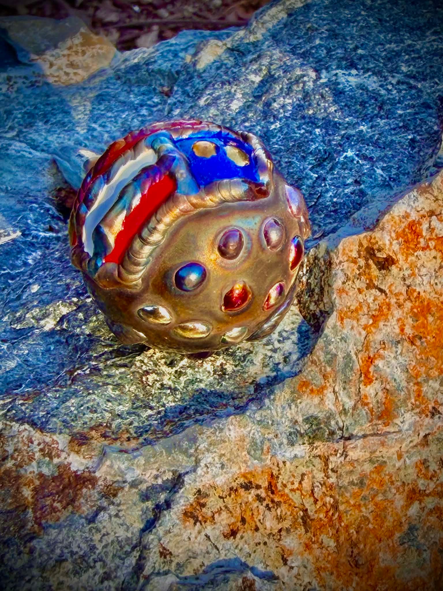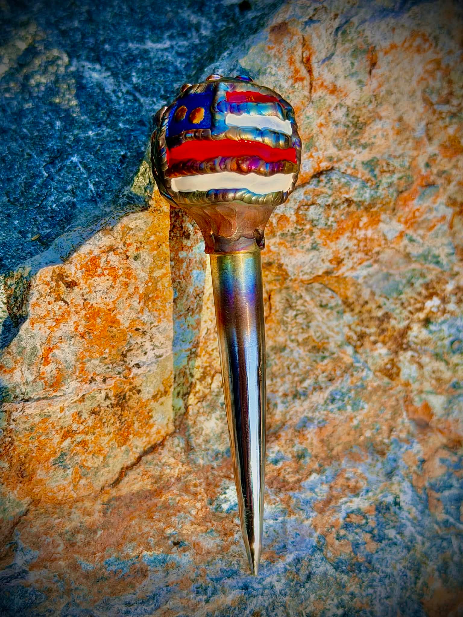 • Custom Details: Features a Red/White/Blue paint filled American Flag, USA weld, and multi-colored weld drops. 3.5” overall length.