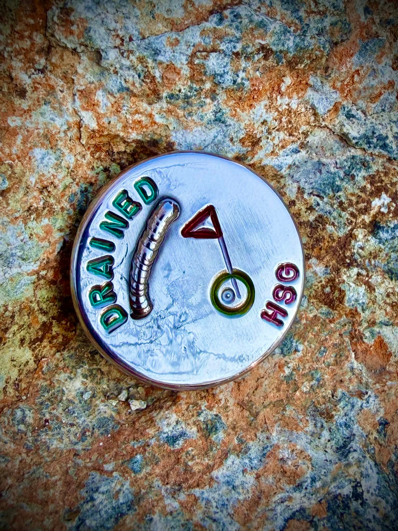 • Signature "Drained" Motif: The back of the marker features "DRAINED" hand-stamped with a welded arc below it, accompanied by a hand stamped PinFlag 🤯